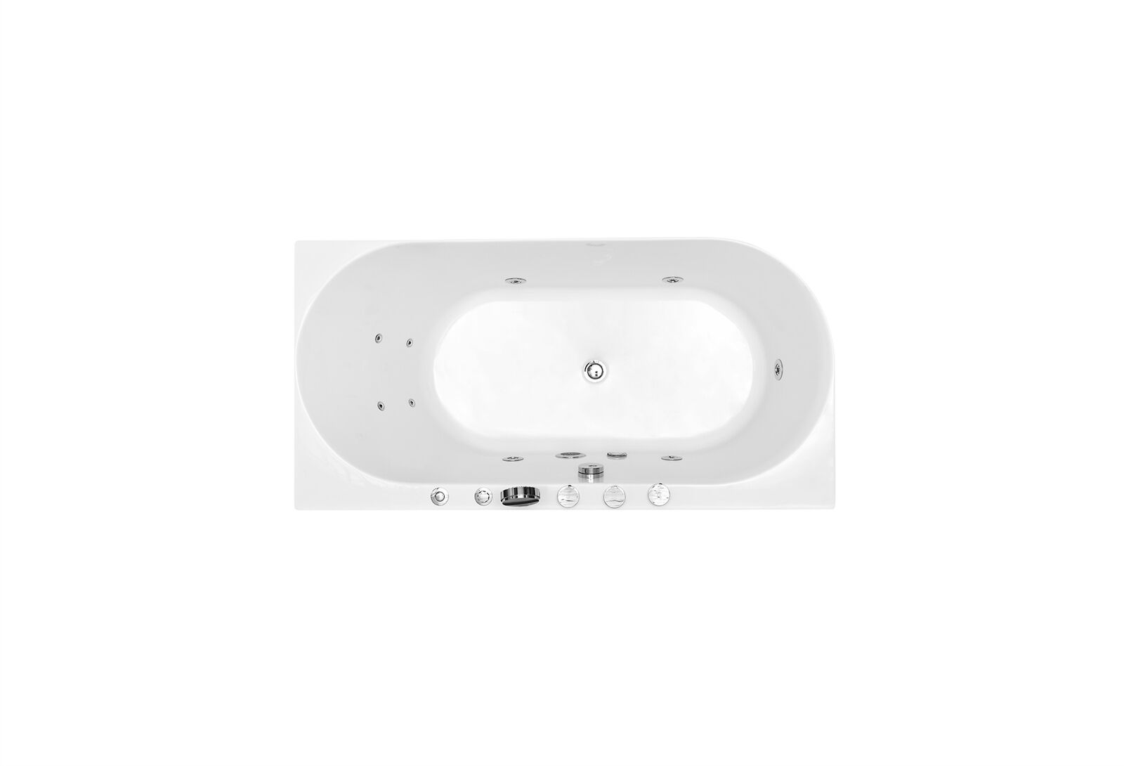 Le opzioni personalizzabili della vasca includono una luce colorata subacquea, massaggio con bolle d'aria, tubi auto-pulenti, riscaldamento termostatico, sterilizzazione all'ozono e un pannello di controllo touch digitale con funzionalità come radio FM, Bluetooth, interfaccia USB e altoparlanti. Il colore bianco elegante si adatta a qualsiasi arredamento, mentre le sue dimensioni permettono di installarla comodamente in casa tua. Approfitta della tecnologia e del comfort offerti da questa vasca idromassaggio per creare un'esperienza di relax indimenticabile direttamente nel tuo bagno.