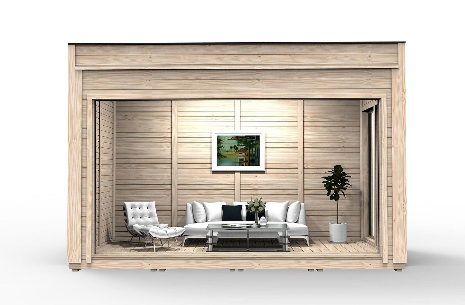 Questo set standard include: tetto resistente, pavimento solido, una porta scorrevole in alluminio da 4m, 2 finestre per una luminosità ottimale, 6 pareti a pannello isolato per il massimo comfort, parapetti di sicurezza, pannelli di finitura esterna ed interna per un aspetto impeccabile. Con uno spessore delle pareti di 145mm e isolamento in lana di roccia di 100mm, questa casa di legno garantisce un ambiente accogliente e ad alto isolamento termico. Scegli la Casa di Legno Casa da Giardino per un'esperienza unica e di lusso nel comfort della tua casa nuova.
