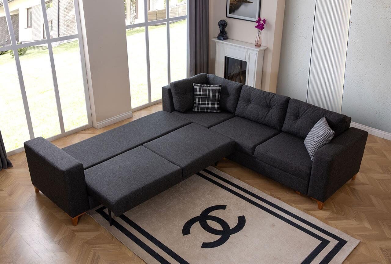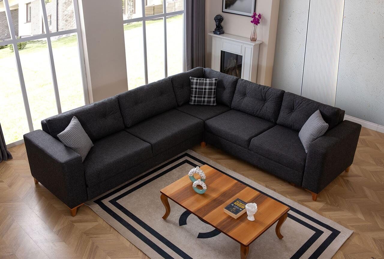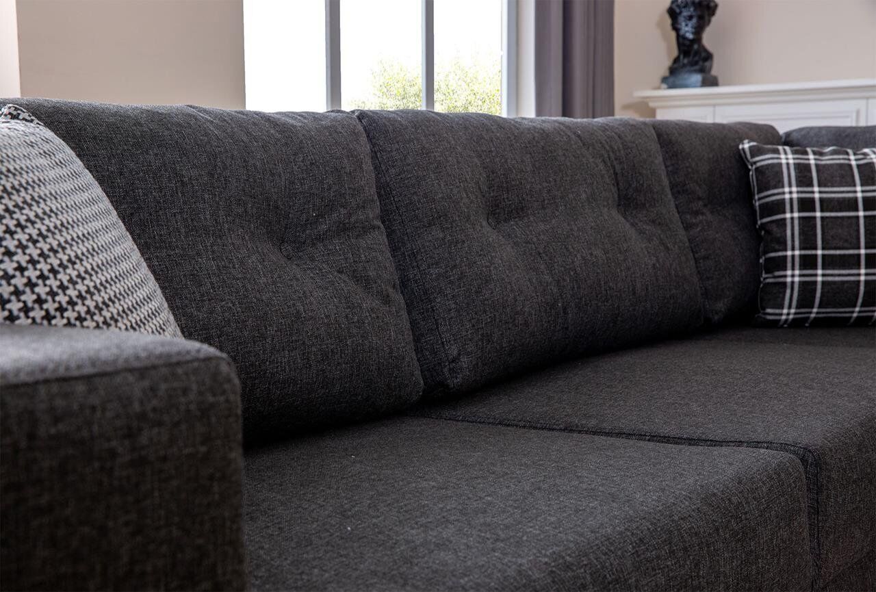 Soggiorno grigio a L, divano in stoffa di design, lusso, divano moderno: Con il nostro elegante divano ad angolo grigio, potrai trasformare il tuo soggiorno in uno spazio sofisticato e accogliente. Le dimensioni generose di ca. 280 x 250 cm offrono spazio sufficiente per rilassarsi e intrattenere gli ospiti. Realizzato con materiali di alta qualità, questo divano garantisce comfort e durata nel tempo. Il design moderno e lussuoso si abbina perfettamente a qualsiasi tipo di arredamento, donando un tocco di eleganza alla tua casa.
