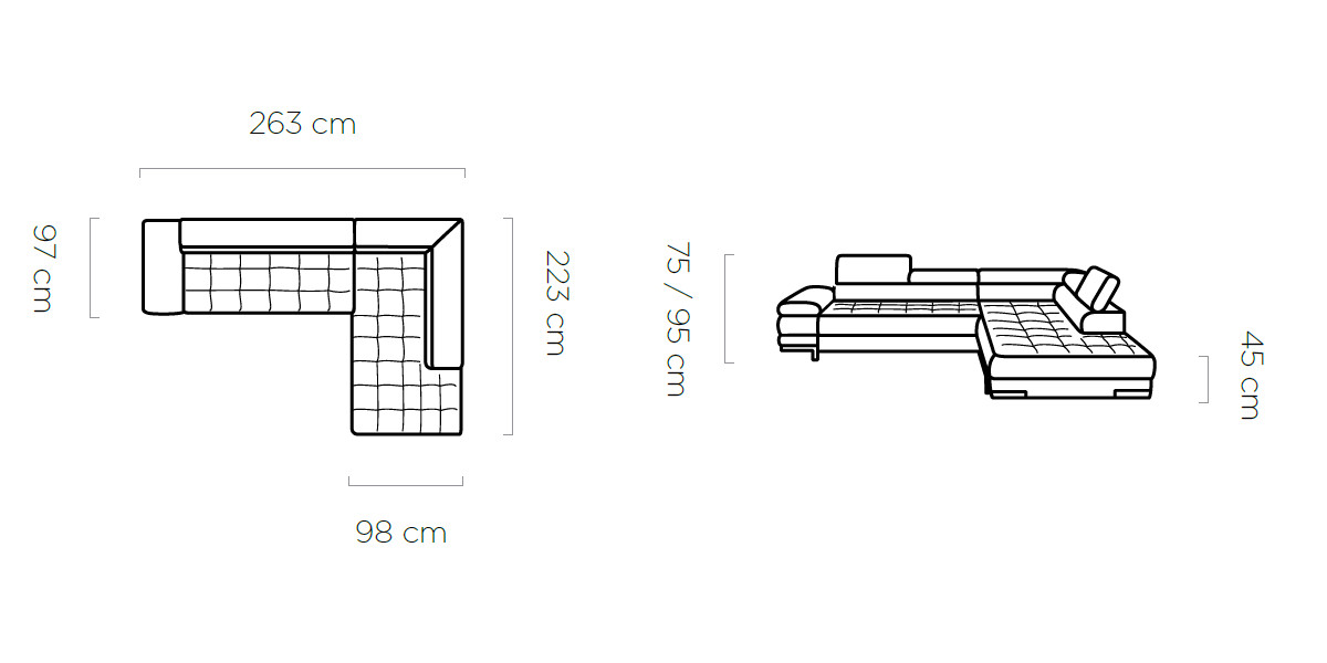 Il Divano d'angolo design a forma di L Moderno è un elegante e funzionale complemento d'arredo per il tuo spazio living. Con le sue dimensioni generose di 263 x 223 x 75/95 cm, offre ampia seduta e massimo comfort per te e i tuoi ospiti. Realizzato con materiali di alta qualità e disponibile in diverse opzioni di colore e materiale, questo divano si adatta perfettamente a qualsiasi stile di arredamento. La struttura interna in legno massello con anima a molle assicura resistenza e durata nel tempo, mentre il contenitore integrato per letto offre una soluzione pratica per gli spazi ridotti.