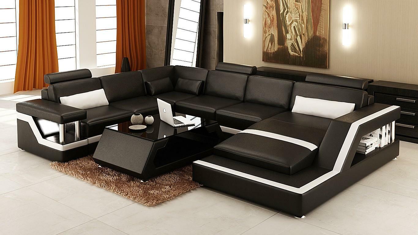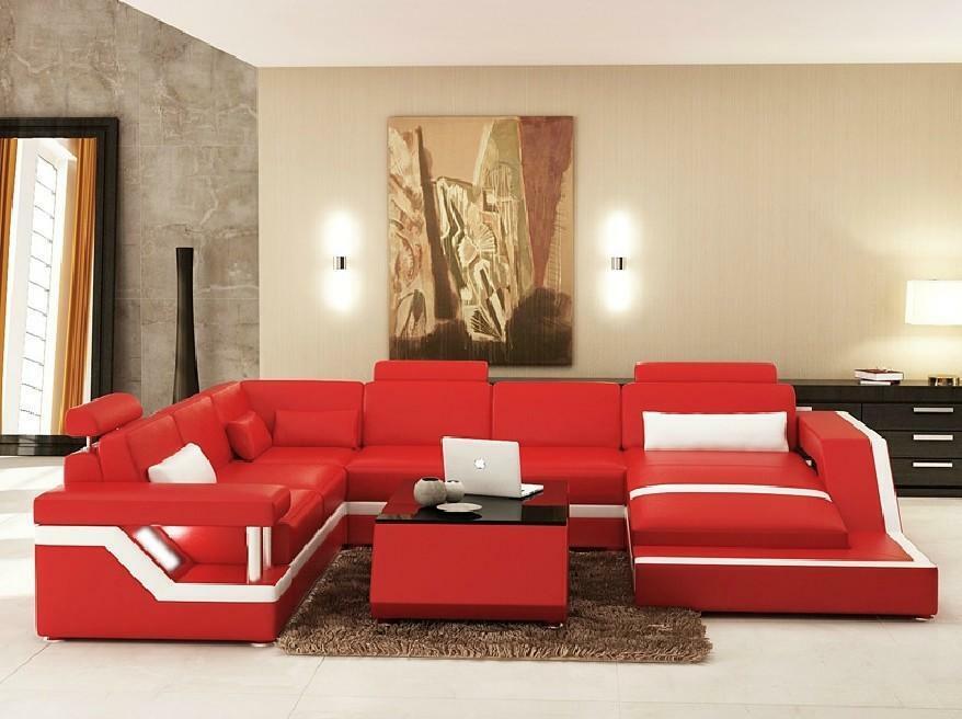 Divano ad angolo imbottito in pelle con illuminazione per il soggiorno.