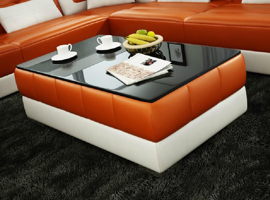 Tavolo da caffè design, tavolo in vetro per soggiorno, divano in pelle.