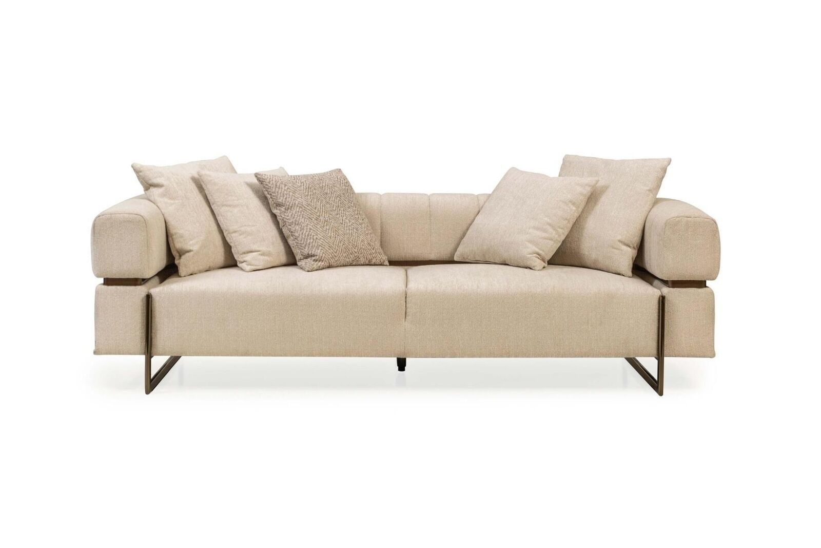 Divano in tessuto beige a tre posti di design, arredamento imbottito, lussuoso divano a tre posti.