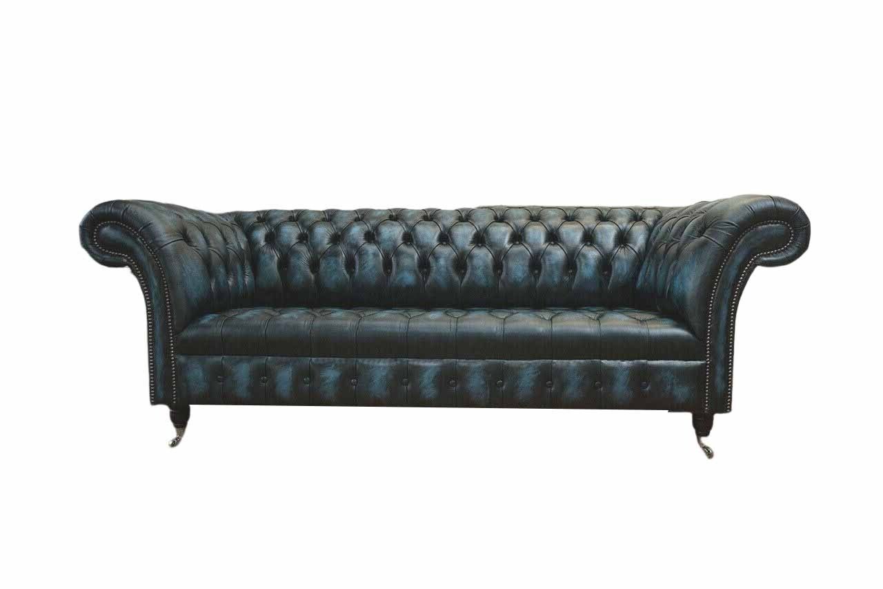 Classico divano a 3 posti Chesterfield in tessuto e pelle blu