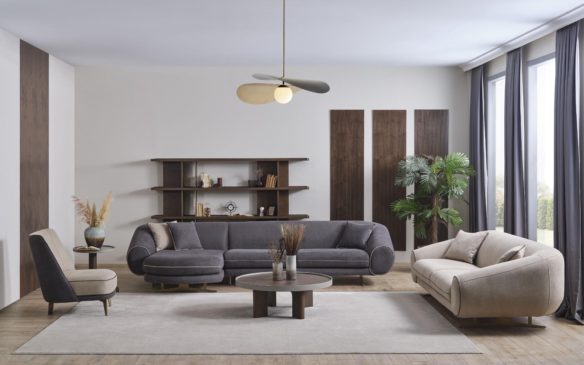 Soggiorno, mobili imbottiti beige, tavolino
