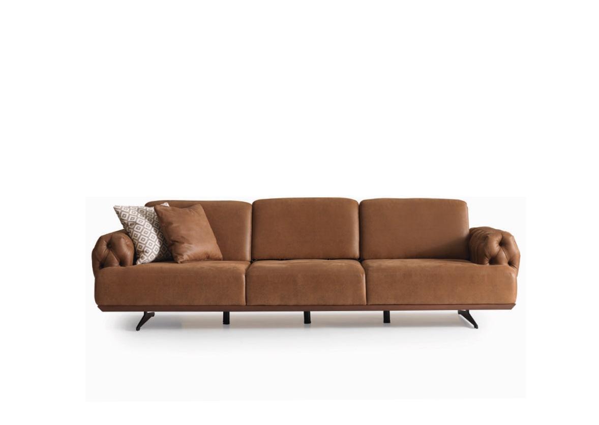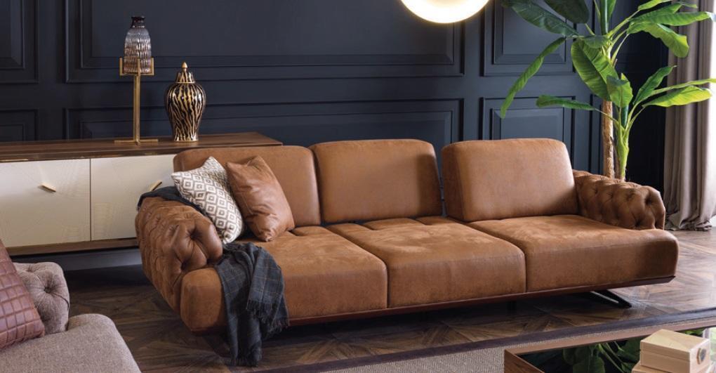 Divano 4 posti design Chesterfield di lusso in tessuto marrone.