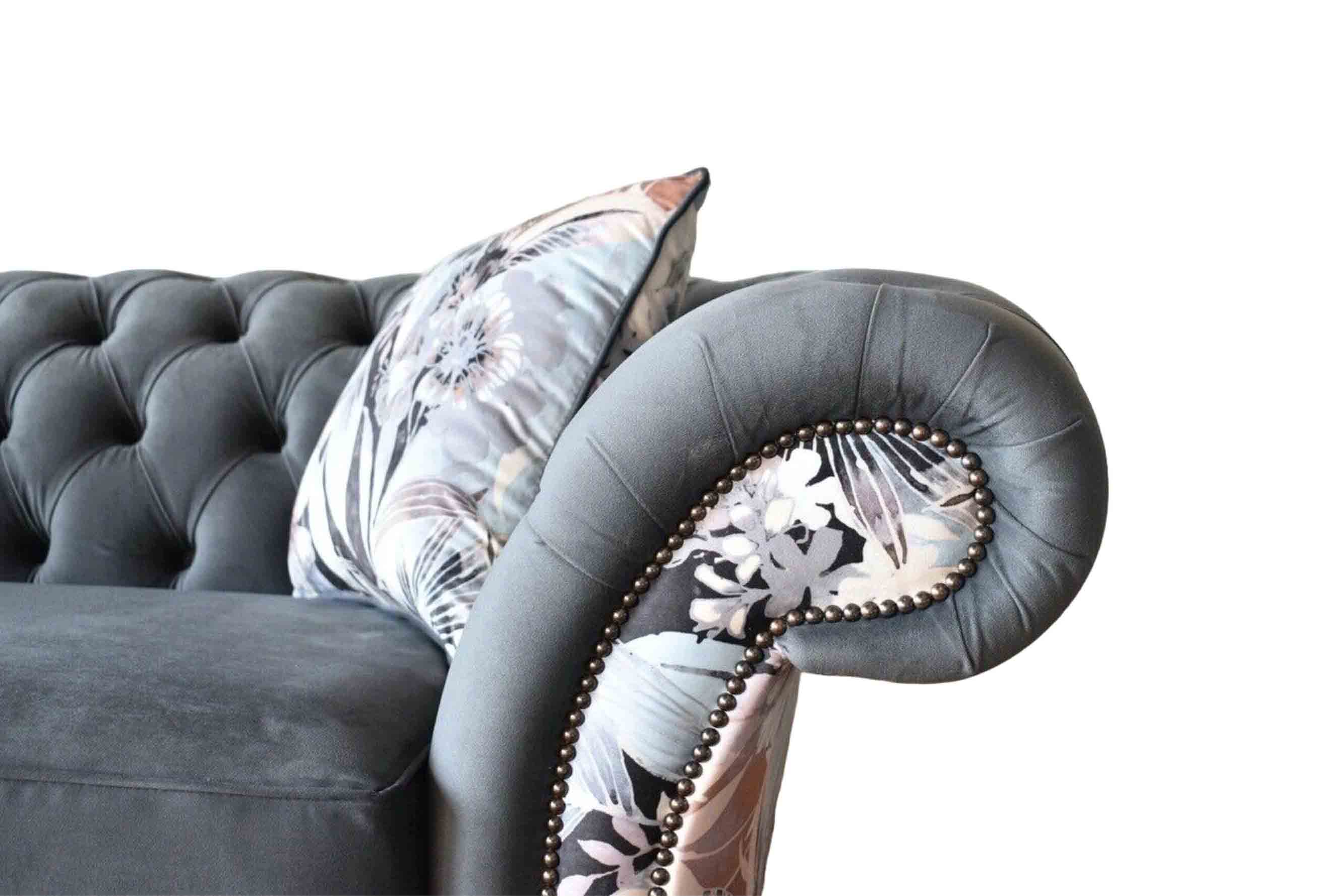 Un vistoso divano a tre posti in stile Chesterfield con delicata decorazione floreale grigia.