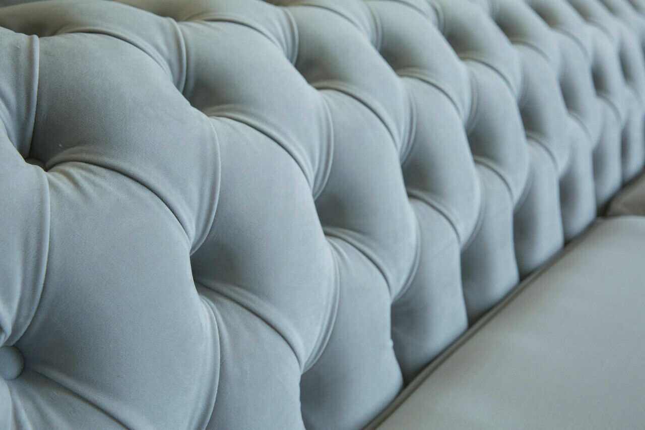 Grigio divano Chesterfield imbottito a 4 posti, stile moderno, in velluto e tessuto di stoffa.