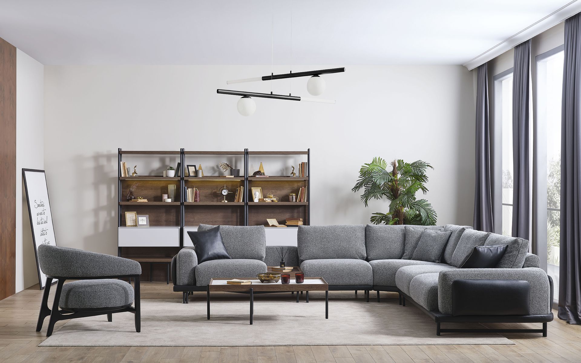 Sofà a L moderno, set da soggiorno grigio, poltrona di design.