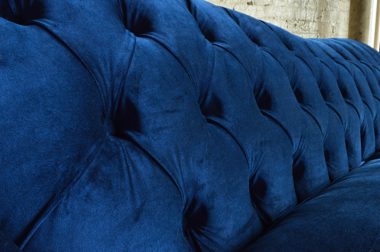 Divano design 4 posti in tessuto blu, divano classico Chesterfield nuovo
