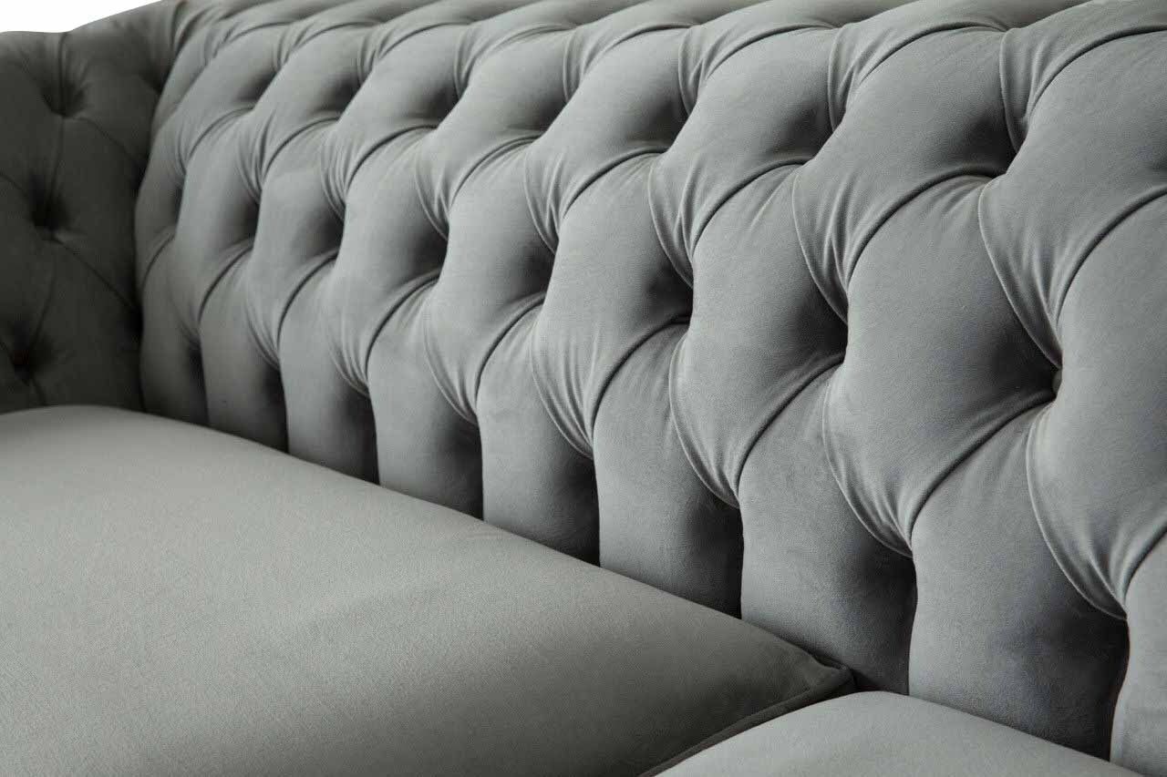 Divano 4 posti Chesterfield imbottito in tessuto grigio per il soggiorno.