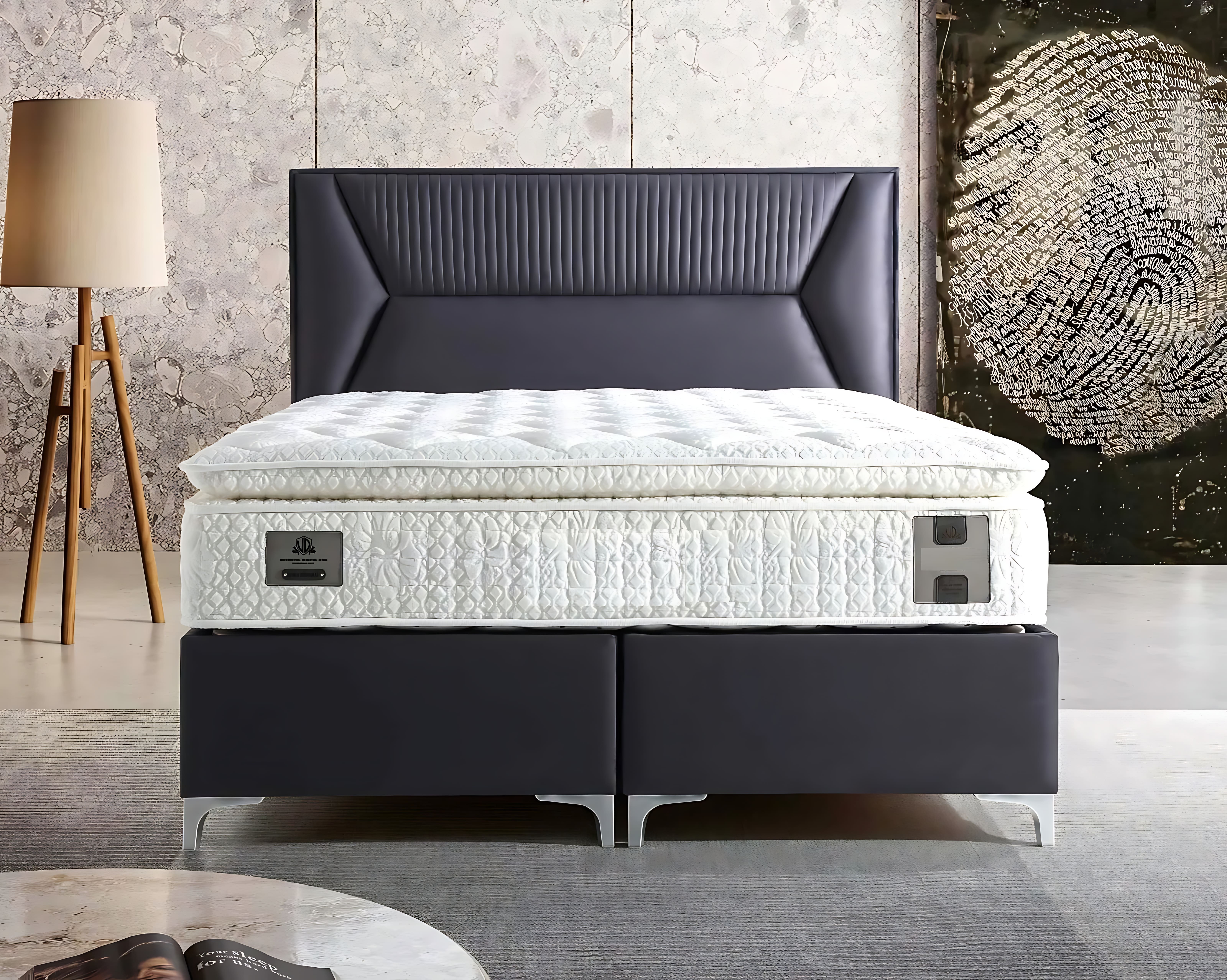 Elegante letto grigio con materasso in tessuto e legno