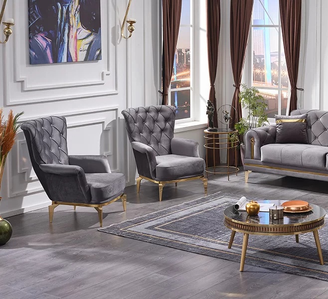 La Poltrona Chesterfield 2x, rivestita in pregiato tessuto poliestere grigio, rappresenta l'apice dell'eleganza e del comfort. La sua silhouette iconica, caratterizzata da un design classico e raffinato, si integra perfettamente in qualsiasi soggiorno di lusso, conferendo un tocco di sofisticata nobiltà. L'imbottitura di alta qualità assicura un'accoglienza avvolgente, rendendola ideale per momenti di relax esclusivi. Ogni dettaglio è curato con maestria, riflettendo l'esperienza di vent'anni del nostro marchio nella creazione di mobili di lusso. Questa poltrona non è solo un complemento d'arredo, ma una dichiarazione di stile che trasforma ogni ambiente in un rifugio di classe. Scegliere la Poltrona Chesterfield 2x significa abbracciare un lifestyle distintivo e senza tempo.