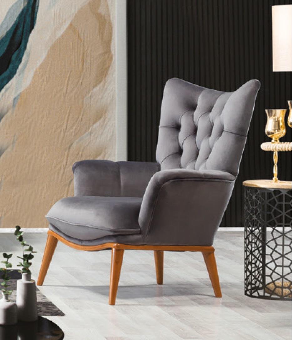 Poltrona monoposto grigia per soggiorno in stile inglese Chesterfield.