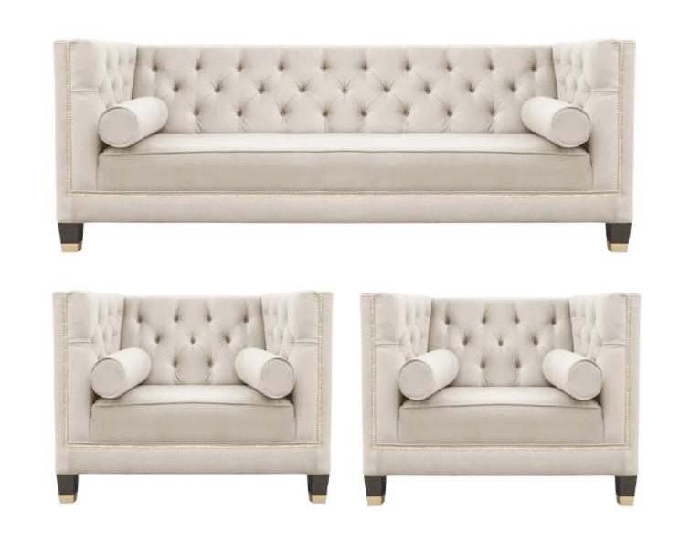 Il **Set di divani per il salotto in velluto imbottito 3 pezzi** è un'elegante aggiunta a qualsiasi spazio abitativo. Con un elegante design Chesterfield, questo set include un divano lungo e due poltrone coordinate, offrendo comfort e stile impeccabili. Realizzato con materiali di alta qualità, il tessuto premium velluto aggiunge un tocco di lusso alla tua casa. La struttura interna in legno massello e le molle a spirale assicurano durata e resistenza nel tempo, mentre l'opzione di scelta tra diversi materiali, inclusa la pelle bovina italiana, ti permette di personalizzare il tuo set in base al tuo gusto personale.