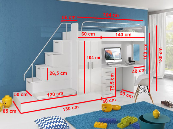 Il letto a castello Armadio Scrivania RAJ 5 è la soluzione perfetta per ottimizzare lo spazio nella camera dei ragazzi. Con il design multifunzionale, questo prodotto intelligente combina un letto a castello con un ampio armadio e una pratica scrivania integrata. Realizzato in resistente MDF e pannello truciolare verniciato opaco, garantisce durata e stile contemporaneo. Le dimensioni generose offrono spazio sufficiente per sonno e studio, consentendo ai ragazzi di godere di un ambiente accogliente e funzionale.