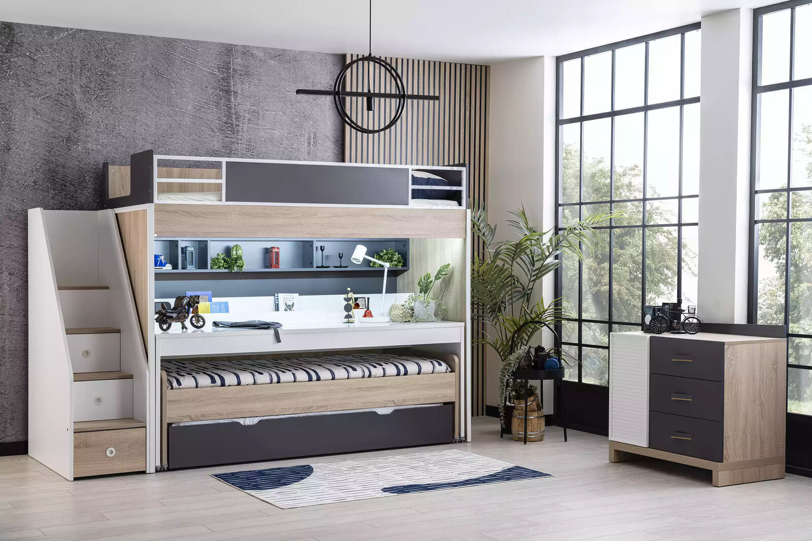 In aggiunta alle dimensioni generose e alla costruzione solida, il Letto a castello di lusso 3 posti letto si distingue per la sua versatilità. Ideale per camere con limitato spazio a disposizione, questo letto a castello offre anche la possibilità di trasformarsi in tre letti separati per adattarsi alle esigenze mutevoli. Con un design elegante e un colore come mostrato, si integra bene in varie decorazioni d'interni. Il materiale resistente in legno assicura durata nel tempo e comfort ottimale per un sonno riposante e rigenerante. Scopri il perfetto connubio tra funzionalità e stile con questo eccezionale Letto a castello in legno.