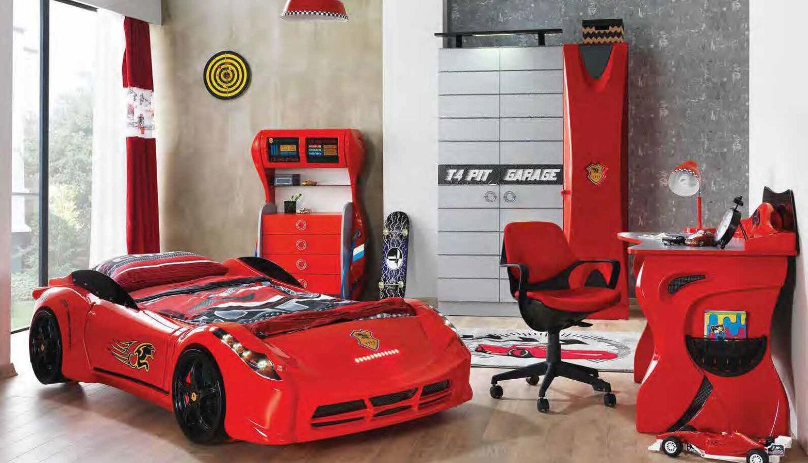 Camera da letto per bambini Set auto Letto Armadio Cassettiera Scrivania Mobili da ragazzi 4 pezzi