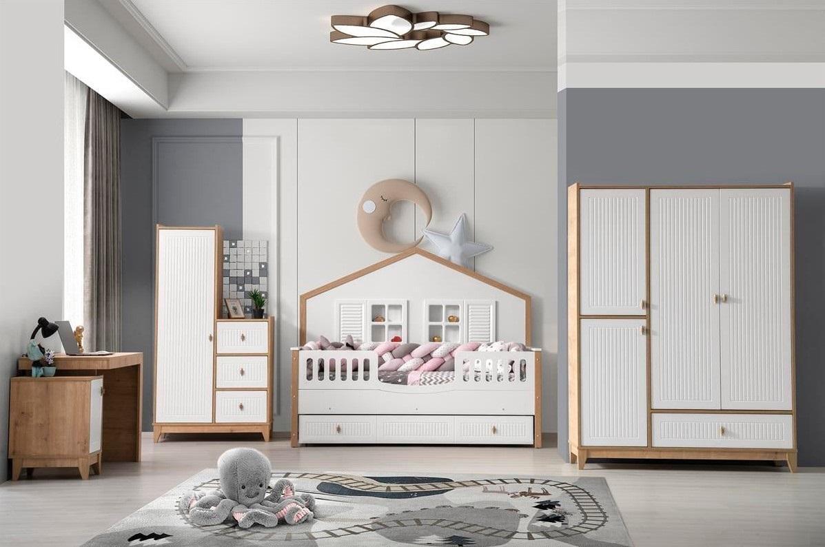 Set per la camera dei bambini elegante, letto, armadio e scrivania, 4 pezzi luminoso.