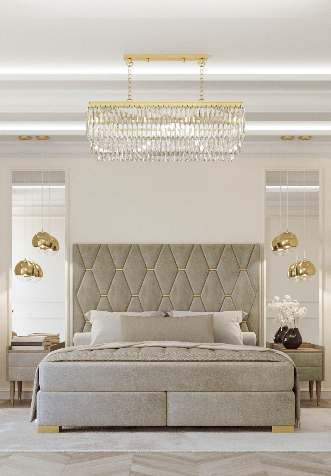Camera da letto grigia Letto matrimoniale Comodini di design Set di lusso 3 pezzi