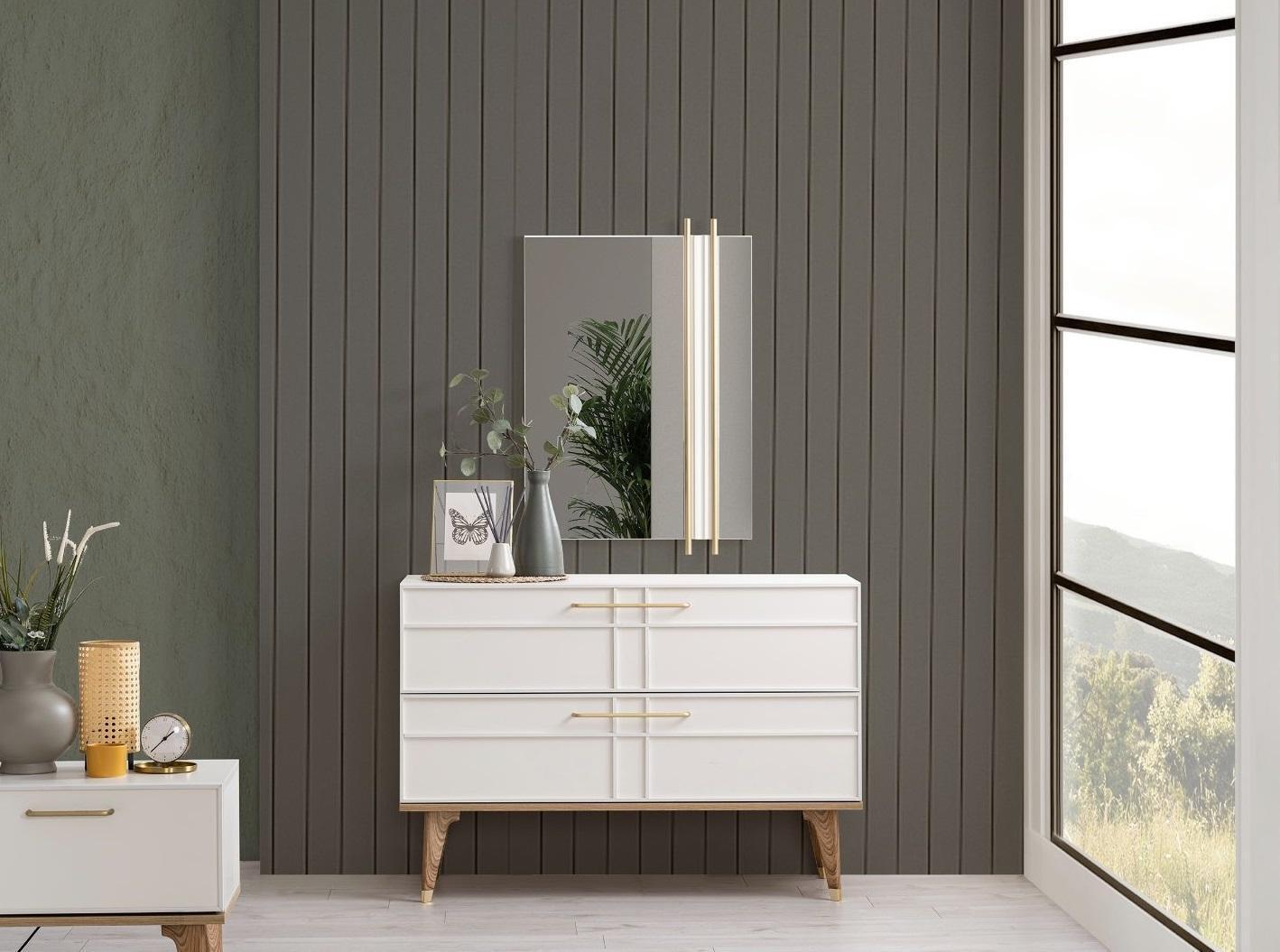 Comò con specchio Camera da letto Consolle Legno Bianco Set 2 pezzi Moderno