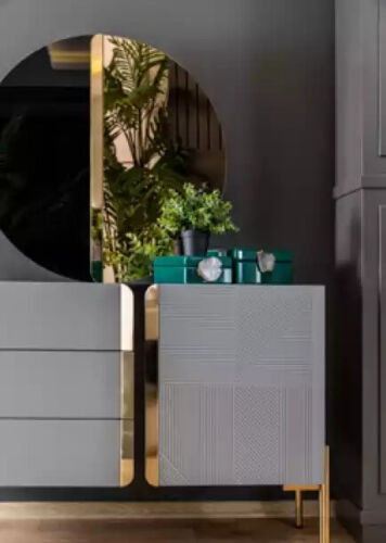 Questo comò non è solo un mobile pratico ma anche un pezzo d'arte, perfetto per chi desidera unire funzionalità ed estetica. Le sue generose dimensioni e l'elegante specchio lo rendono ideale per essere posizionato in un angolo della camera da letto, offrendo un'area preziosa per la cura personale. I toni caldi del grigio e gli intarsi dorati si integrano facilmente in una varietà di stili d'arredo, dal classico al moderno. Immagina questo comò come il punto focale della tua stanza, capace di riflettere non solo la tua immagine ma anche il tuo stile personale con classe e sofisticatezza.