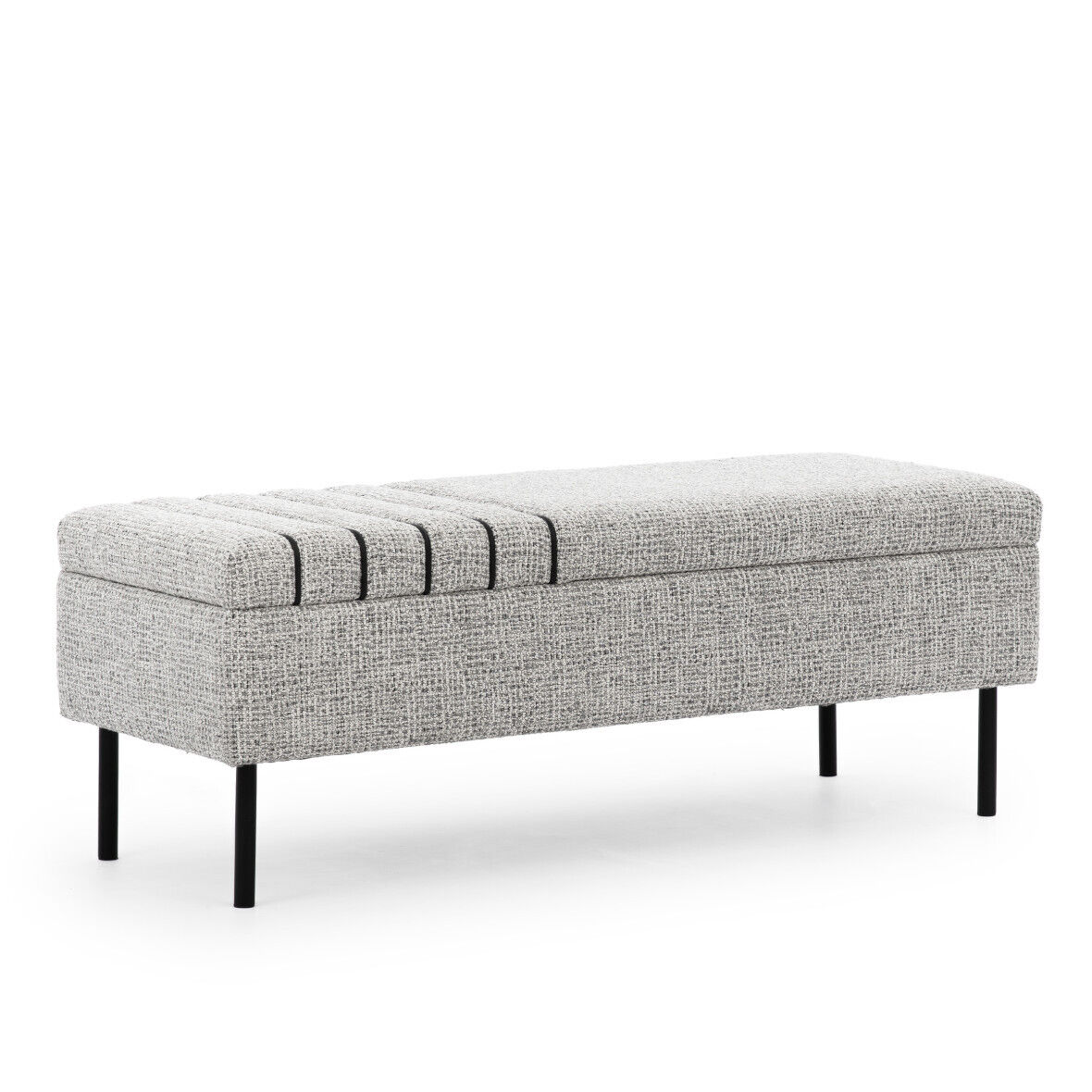 Mobili da camera grigi chiaro, letto in tessuto di design, 2 comodini, panca.