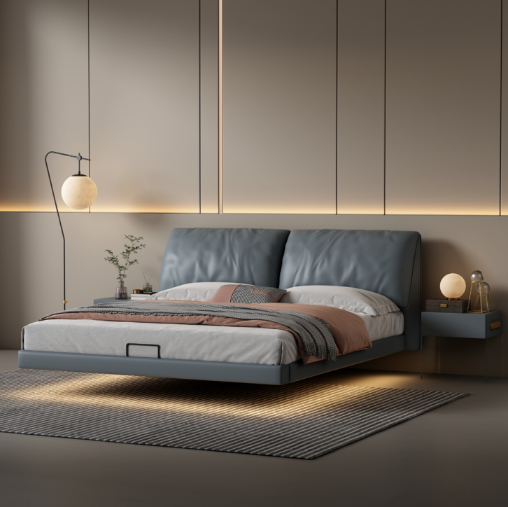 Camera da letto grigia Letti da designer Struttura in legno Mobili di lusso moderni