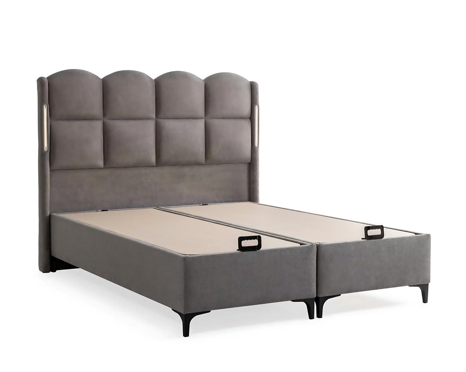 Letto grigio con materasso in tessuto e legno, design moderno