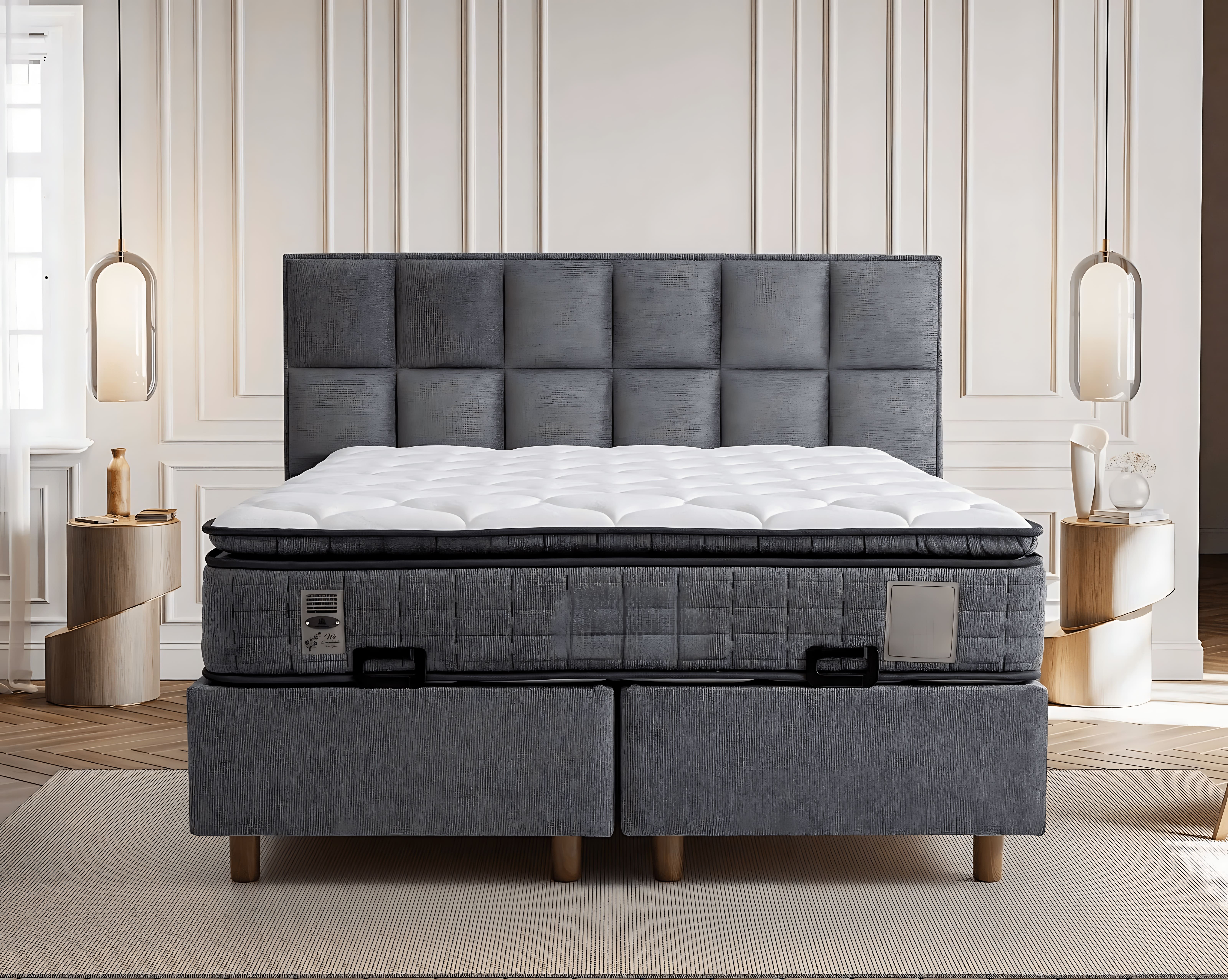 Il letto moderno grigio con materasso in tessuto e legno rappresenta l'apice dell'eleganza contemporanea. Realizzato con un accattivante rivestimento grigio e un robusto telaio in legno, questo letto è un esempio di design raffinato e funzionalità. La sua silhouette pulita e le linee armoniose si integrano perfettamente in un ambiente esclusivo, conferendo un tocco di lusso a qualsiasi camera da letto. Il materasso in tessuto offre un comfort superiore, garantendo un riposo rigenerante. Questo pezzo non è solo un arredo, ma un investimento in uno stile di vita sofisticato, pensato per chi desidera circondarsi di bellezza e qualità. Scegliere questo letto significa abbracciare un'eleganza senza tempo.
