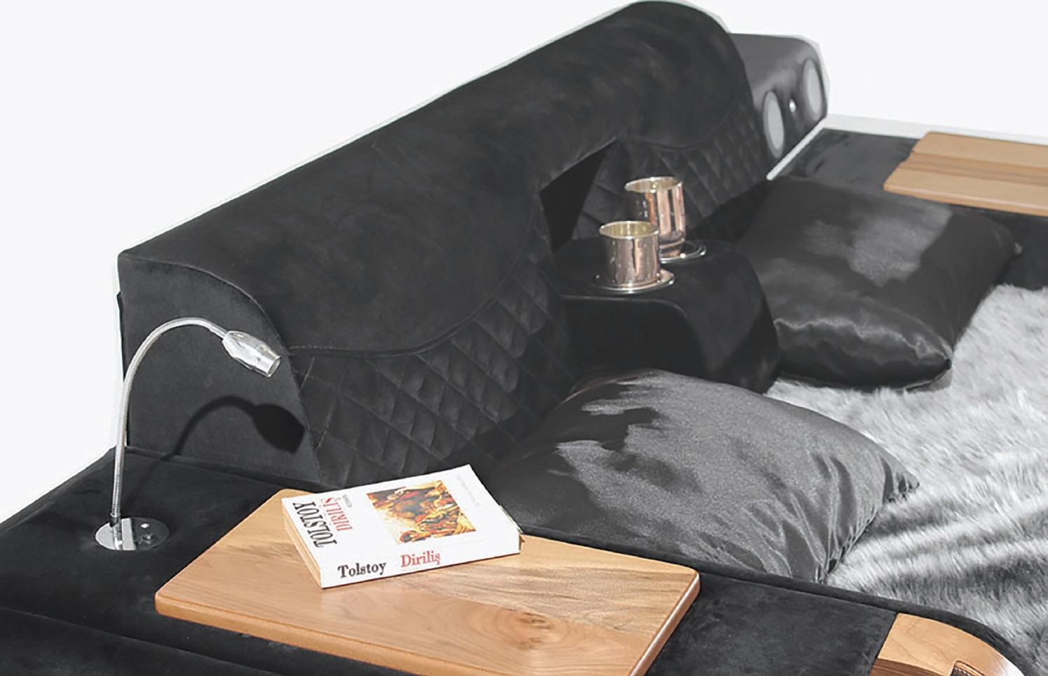 Caratteristiche: Porta USB, sistema audio con Bluetooth, sollevatore per TV, armadietto bar, molti ripiani, altoparlanti, lettino relax con funzione massaggio