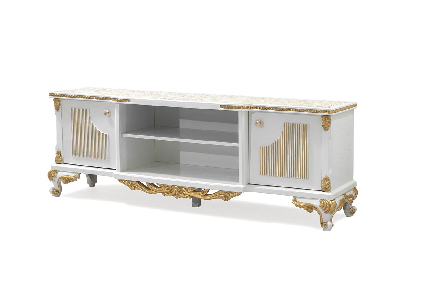 Con la lunghezza di circa 245 cm, l'altezza di 100 cm e la larghezza di 76 cm, questo mobile TV è perfetto per chi cerca un design classico e raffinato. Grazie alla struttura interna in legno massello, offre una base solida per il televisore e gli altri dispositivi multimediali. Può essere utilizzato non solo come supporto TV, ma anche come elemento d'arredo funzionale per conservare libri, oggetti decorativi o altri apparecchi elettronici. Con il suo stile barocco, questo mobile porta TV aggiungerà un tocco di eleganza e charme alla tua casa.