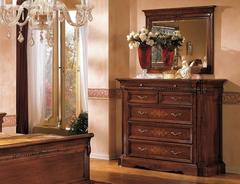 Comò in legno massiccio con specchio, credenza con specchiera, set di comodini. Mobili italiani 2 pezzi.