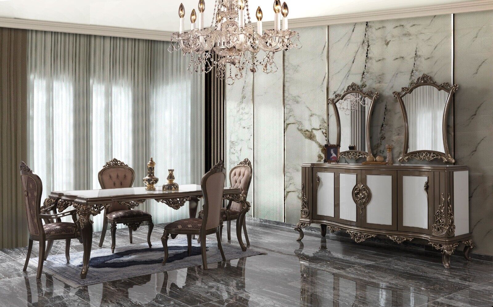 Il Completo gruppo da pranzo Sala da pranzo Tavolo da pranzo Set in legno 12 pezzi Marrone Madia è l'ideale per arredare la tua sala da pranzo con stile e funzionalità. Questo set completo comprende un tavolo da pranzo spazioso con dimensioni di circa 210x110x78 cm, sedie eleganti che misurano circa 55x50x100 cm e una credenza con specchio di circa 210x50x165 cm. Realizzato in legno di alta qualità e tessuto resistente, questo set si distingue per la sua robustezza e design raffinato. Il colore marrone conferisce un tocco di calore e eleganza all'ambiente circostante, creando un'atmosfera accogliente e accogliente.