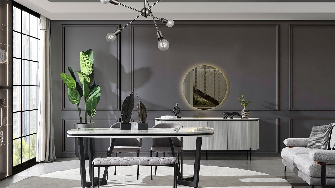 Set da pranzo moderno composto da tavolo da pranzo, 4 sedie e credenza con specchio