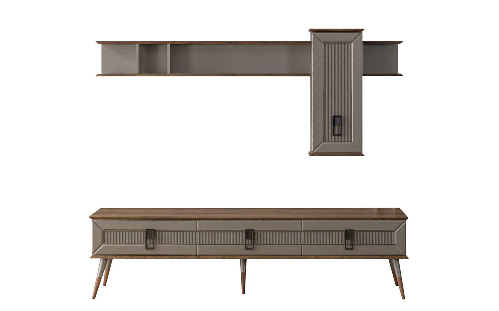 Questo elegante arredamento di design per il soggiorno è la soluzione completa per la tua area di intrattenimento. Il set include un supporto TV in legno dai dettagli curati e raffinati, perfetto per ospitare schermi di grandi dimensioni. Con scaffali ben strutturati per organizzare dispositivi multimediali e oggetti decorativi, e un tavolino dal design moderno per completare lo spazio, questo set RTV nuovo renderà il tuo soggiorno un ambiente accogliente e stiloso.