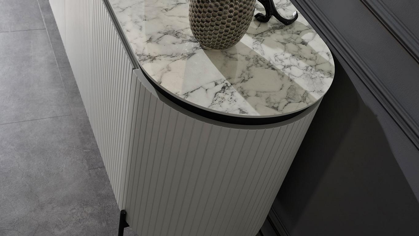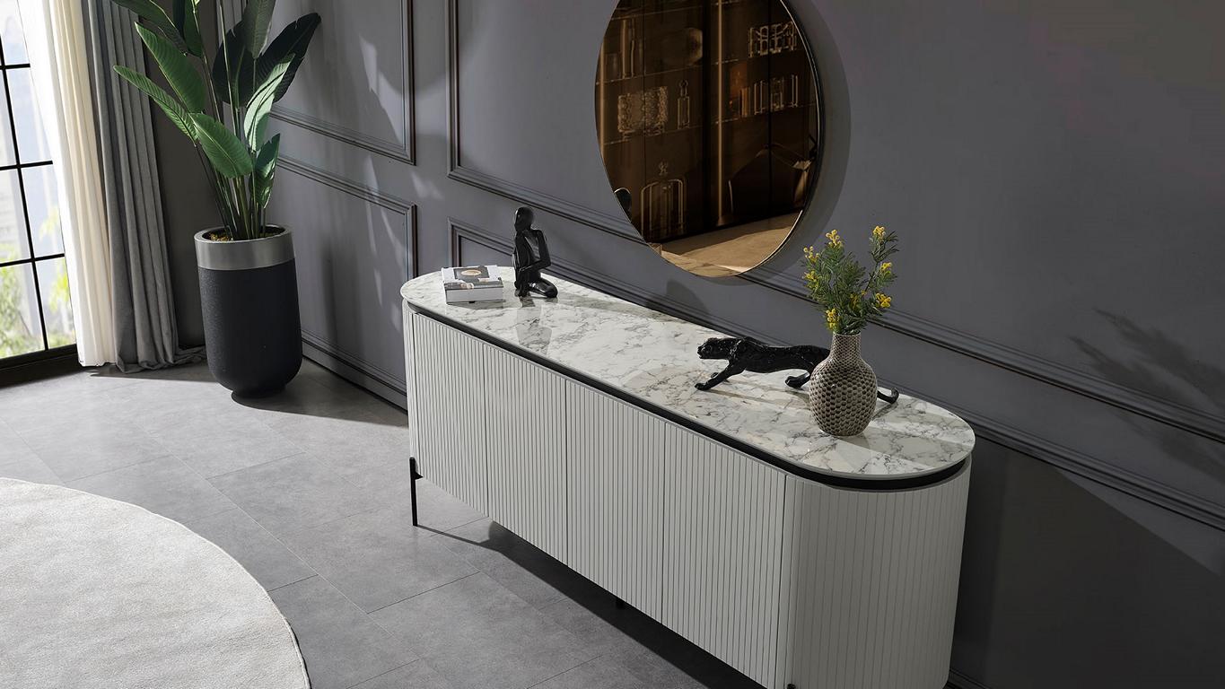 Set da pranzo elegante composto da credenza e specchio. Colore bianco. 2 pezzi.