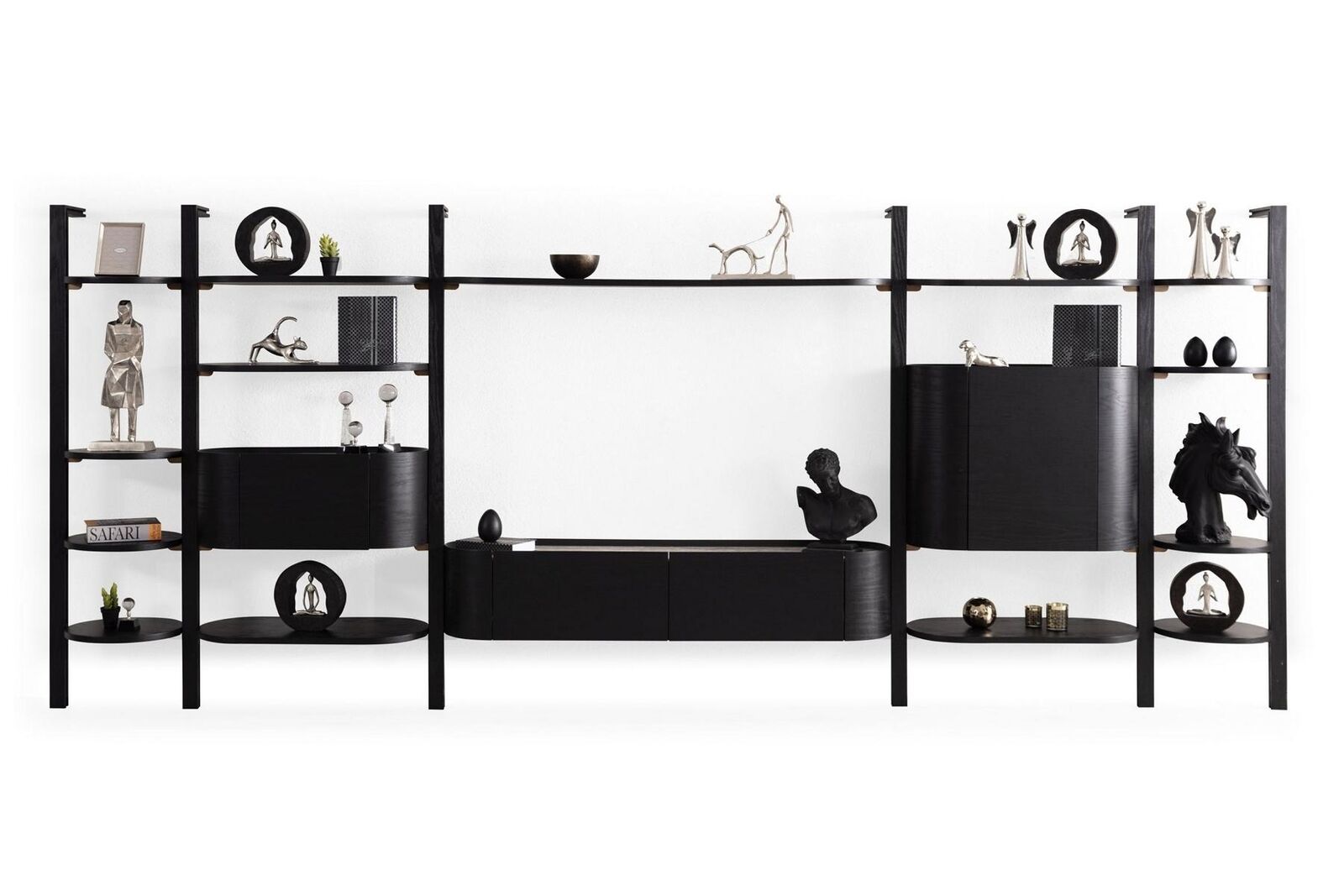 Esclusiva parete attrezzata nera, mobili da soggiorno di design, parete in legno pregiato