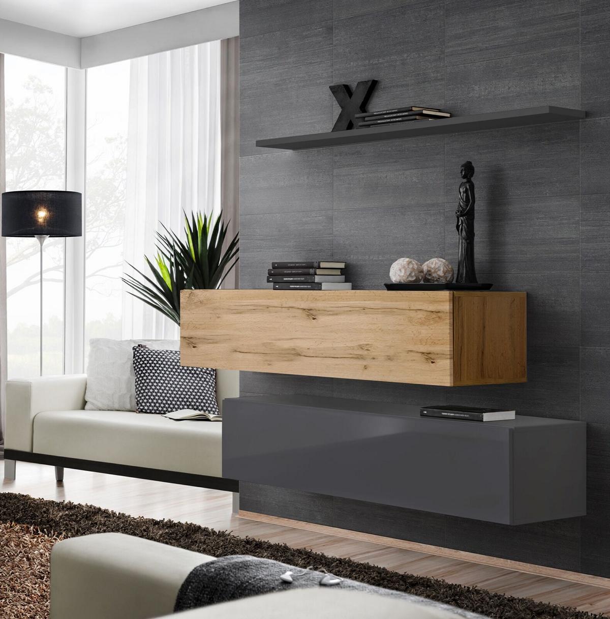 Con il Set parete soggiorno 3 pezzi, la vostra area giorno verrà trasformata in uno spazio moderno e accogliente, ideale per accogliere ospiti o per trascorrere momenti di relax in famiglia. Realizzato in robusto legno, questo set garantisce un’eccellente durata e stabilità, mantenendo un'estetica di classe nel tempo. Potete utilizzare gli armadi a muro per conservare documenti importanti o articoli per la casa, mentre il mobile soggiorno è perfetto per sistemare dispositivi elettronici o creare una postazione TV. La mensola da parete offre infinite possibilità di personalizzazione, consentendovi di esporre le vostre fotografie preferite o di arricchire la stanza con piante e oggetti d’arte. Questo set è l'opzione perfetta per ottimizzare gli spazi senza rinunciare allo stile e alla funzionalità.