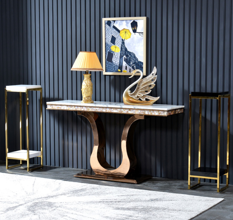 Tavolo console in acciaio inossidabile di design è un elegante e moderno pezzo di arredamento che unisce stile e funzionalità. Con dimensioni di circa 120 x 40 x 82 cm, questo tavolo console KD-D002 è ideale per aggiungere un tocco di classe e sofisticatezza a qualsiasi ambiente. Realizzato con materiali di alta qualità, come il marmo e l'acciaio inossidabile, questo tavolo è resistente e durevole nel tempo. Il colore mostrato conferisce un aspetto raffinato e contemporaneo alla tua casa o ufficio.