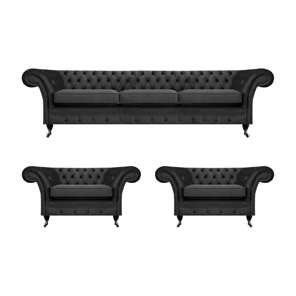 Chesterfield nero, set divani imbottiti, set da salotto 3 pezzi, 3+1+1.