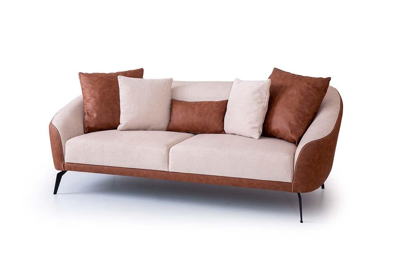 Abito da soggiorno marrone-beige, set divano design a tre posti e poltrona di lusso.