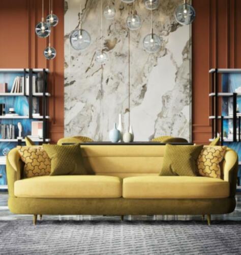 Divano design Lounge in velluto giallo con divano a 3 posti + 1 poltrona.