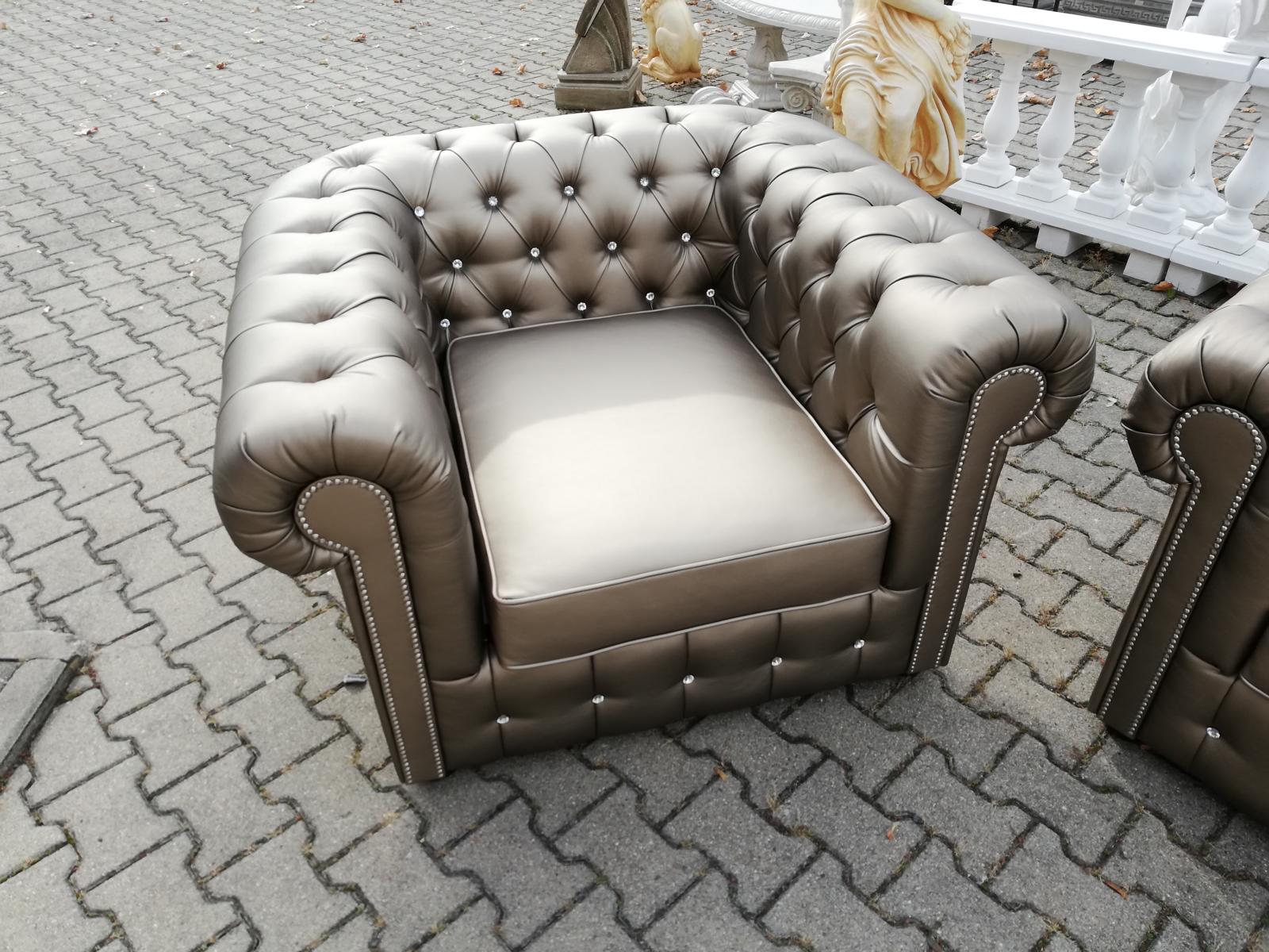 Designer Chesterfield set da divano 2+1 divano divano imbottito set seduta oro porta l'eleganza e lo stile classico direttamente nel tuo spazio abitativo. Con misure di ca. 165 x 110 x 80 cm per il divano a due posti e ca. 110 x 110 x 80 cm per la poltrona, questo set vanta una costruzione di alta qualità con materiali premium. La possibilità di trasformare il divano in un comodo letto con materasso opzionale offre praticità e comfort senza compromettere lo stile sofisticato. Potrai personalizzare ulteriormente il set scegliendo tra una vasta gamma di colori e materiali, tra cui pelle sintetica premium, vera pelle italiana e tessuti di alta qualità.