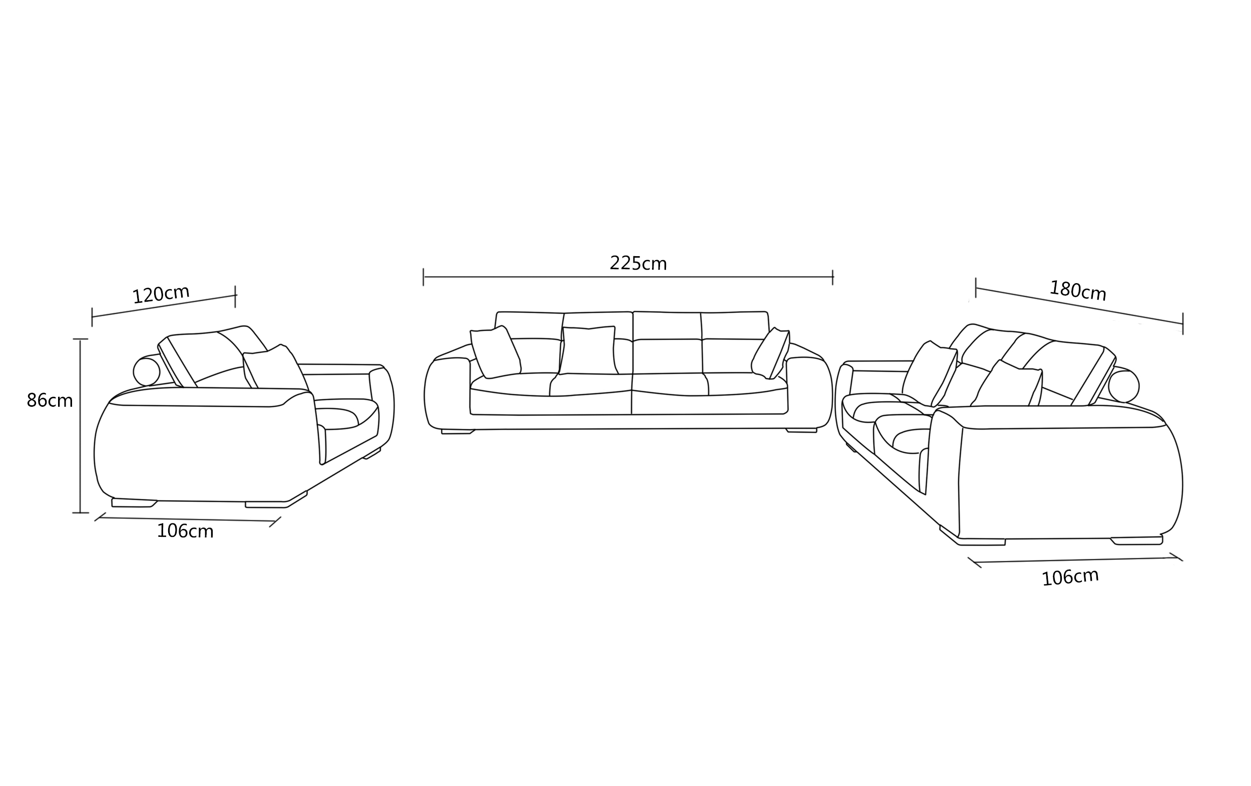 Sofà moderno 3+2+1 posti set divani design divano imbottito divani: Questo elegante set di divani è l'ideale per arredare il tuo spazio living con stile e comfort. Con un design moderno e accattivante, il set include un divano a 3 posti, un divano a 2 posti e una poltrona, offrendo soluzioni per diverse esigenze di seduta. Le dimensioni generose di ca. 225 x 86 x 106 cm per il divano a 3 posti, ca. 180 x 86 x 106 cm per il divano a 2 posti e ca. 120 x 86 x 106 cm per la poltrona assicurano spazio sufficiente per rilassarsi e socializzare. La struttura interna in legno massello garantisce solidità e durabilità nel tempo.