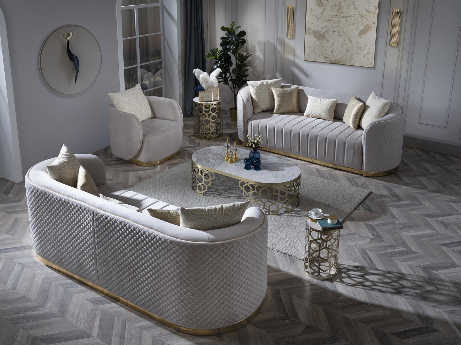 Divano di lusso, set di divani ovali imbottiti in velluto tessuto 3+2+1 pezzi.