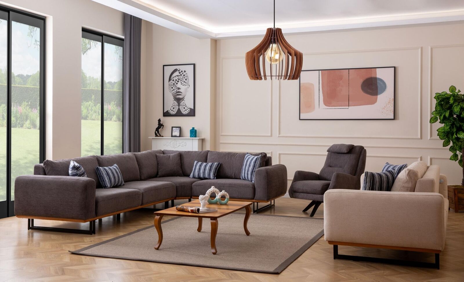 Con il Set soggiorno design, trasforma il tuo spazio in un ambiente accogliente e di classe. Questo set include un divano ad angolo a forma di L, un comodo divano da 3 posti e una elegante poltrona, offrendo comfort e stile in un unico pacchetto. Realizzato con materiali di alta qualità come legno e tessuto, questo set rappresenta la combinazione perfetta di funzionalità e design moderno. Con le sue generose dimensioni e il colore elegante, questo set si adatta perfettamente a diverse tipologie di arredamento, aggiungendo un tocco di raffinatezza al tuo soggiorno.
