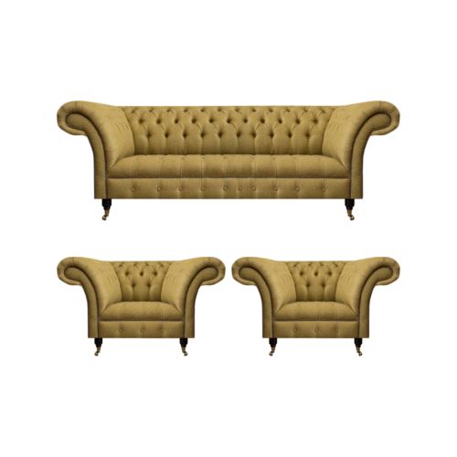 Set Salotto Giallo Completo: Aggiungi un tocco di eleganza e comfort al tuo spazio abitativo con questo set salotto completo. Il set include un divano a tre posti e due poltrone Chesterfield, tutto realizzato con cura per offrire stile e qualità. Il vivace colore giallo aggiunge luminosità e personalità alla tua casa, mentre le dimensioni generose assicurano spazio sufficiente per il relax e l'intrattenimento.